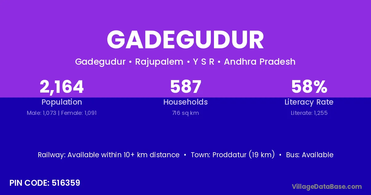Proddatur (19 km) is the nearest town to Gadegudur village for major economic activities and is located approximately 19 km away.