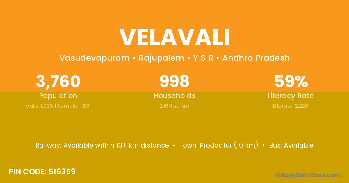 Proddatur (10 km) is the nearest town to Velavali village for major economic activities and is located approximately 10 km away.