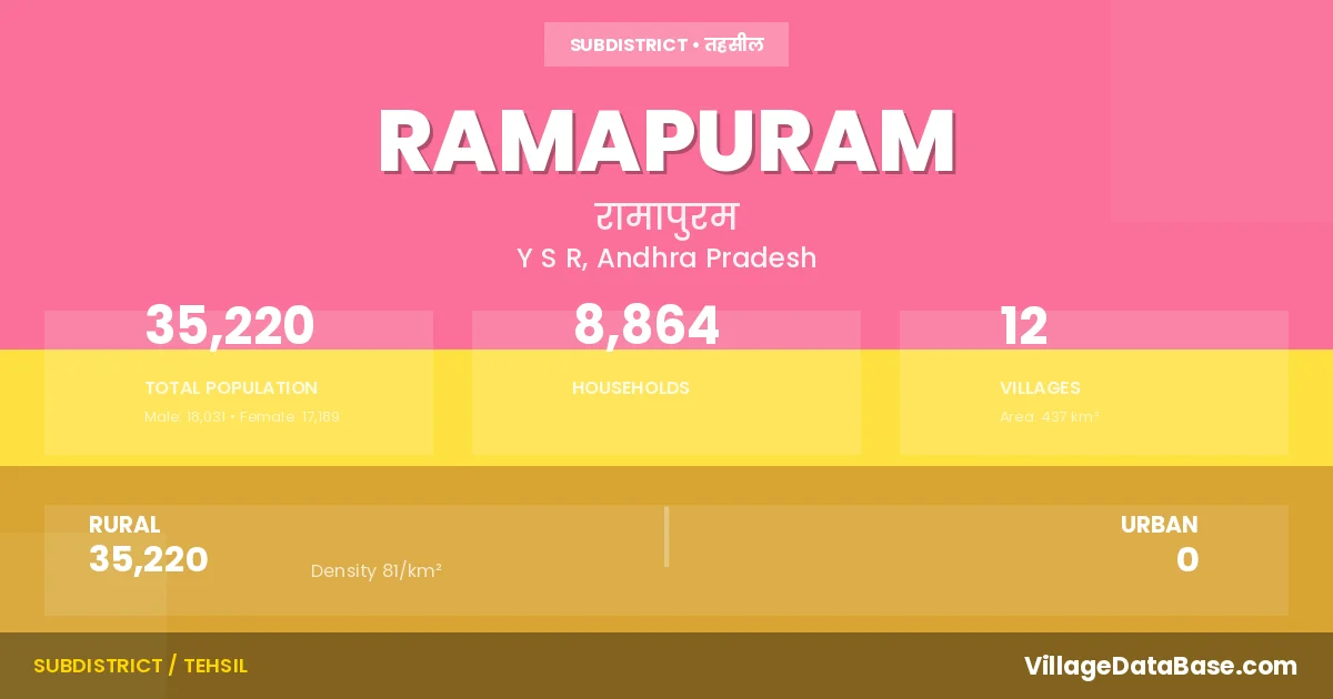 Ramapuram is a town and Mandal in the Y S R district of the Andhra Pradesh. In India, a Mandal is a subdivision of a district responsible for the administration and revenue collection of a specific area within the district. Mandals play a crucial role in the local governance structure, contributing significantly to the development and administration of their communities.