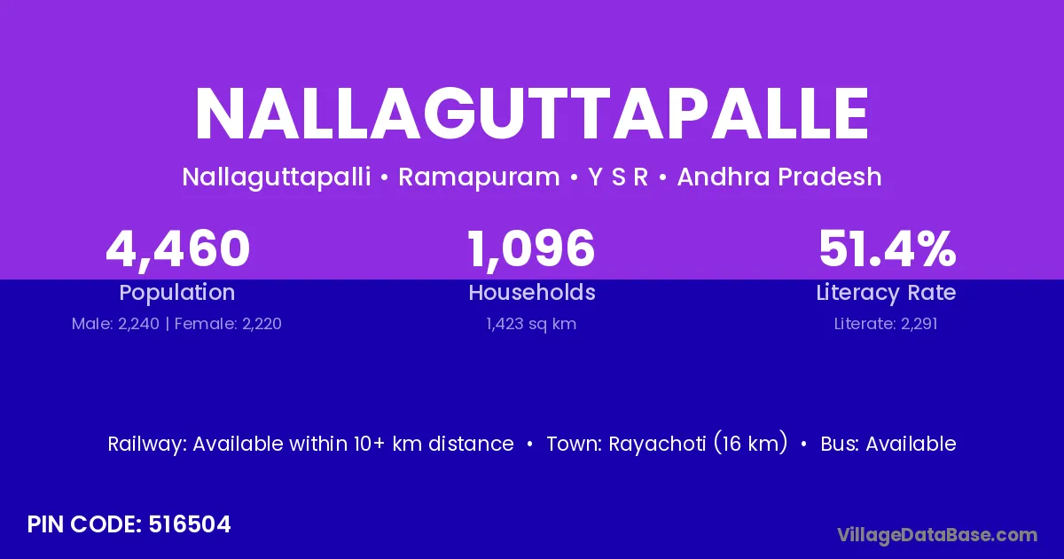 Rayachoti (16 km) is the nearest town to Nallaguttapalle village for major economic activities and is located approximately 16 km away.