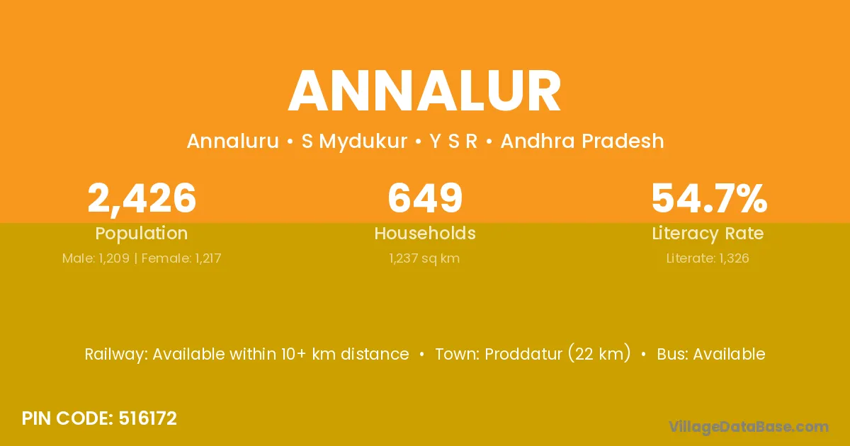 Proddatur (22 km) is the nearest town to Annalur village for major economic activities and is located approximately 22 km away.