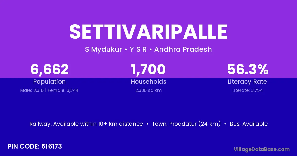 Proddatur (24 km) is the nearest town to Settivaripalle village for major economic activities and is located approximately 24 km away.