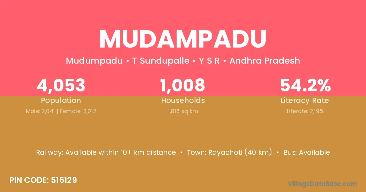 Rayachoti (40 km) is the nearest town to Mudampadu village for major economic activities and is located approximately 40 km away.
