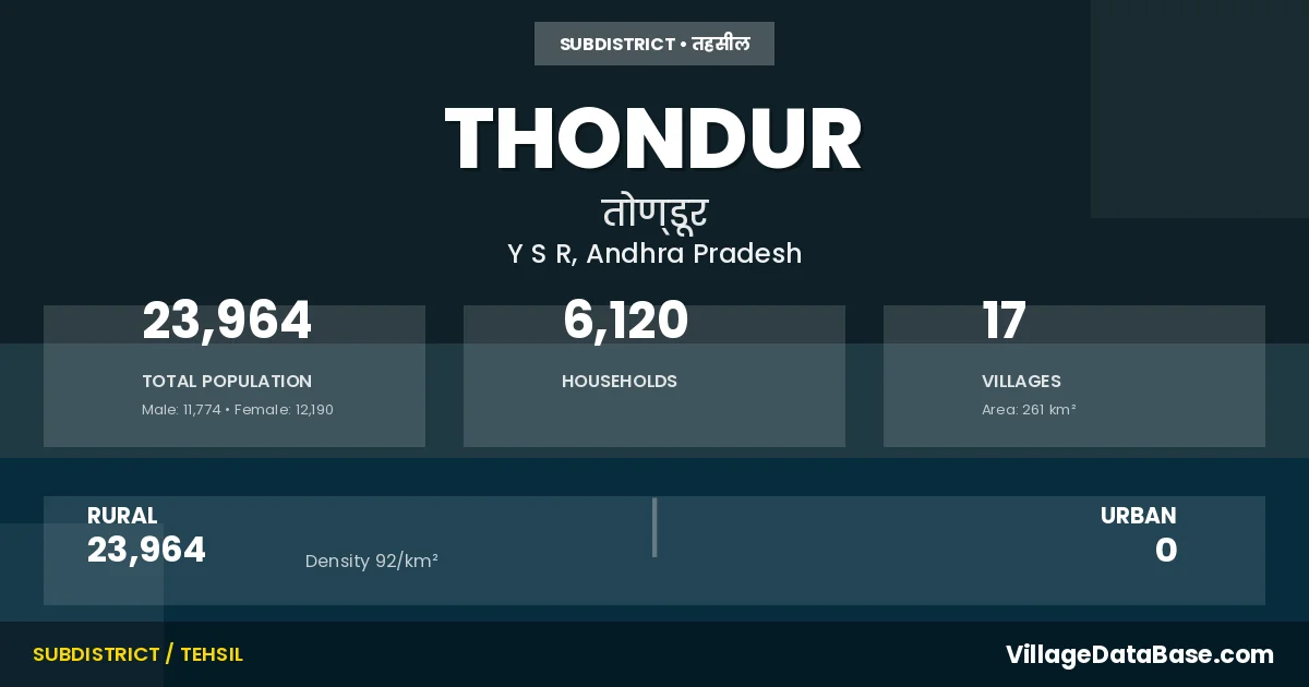 Thondur is a town and Mandal in the Y S R district of the Andhra Pradesh. In India, a Mandal is a subdivision of a district responsible for the administration and revenue collection of a specific area within the district. Mandals play a crucial role in the local governance structure, contributing significantly to the development and administration of their communities.