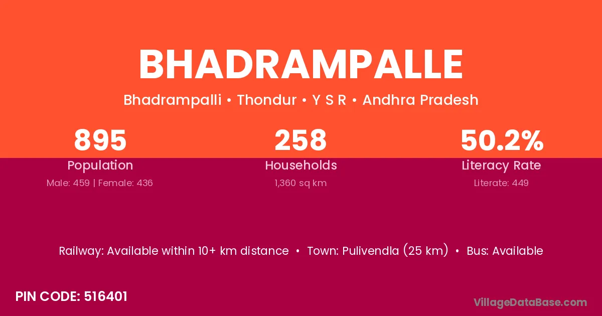 Pulivendla (25 km) is the nearest town to Bhadrampalle village for major economic activities and is located approximately 25 km away.