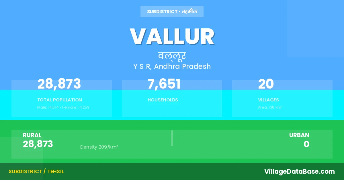 According to the 2011 census The total area of Vallur Mandal is 138 km², with a population of 28873 people. The population density is 209 inhabitants per square kilometre, and there are approximately 7651 houses in the sub district.