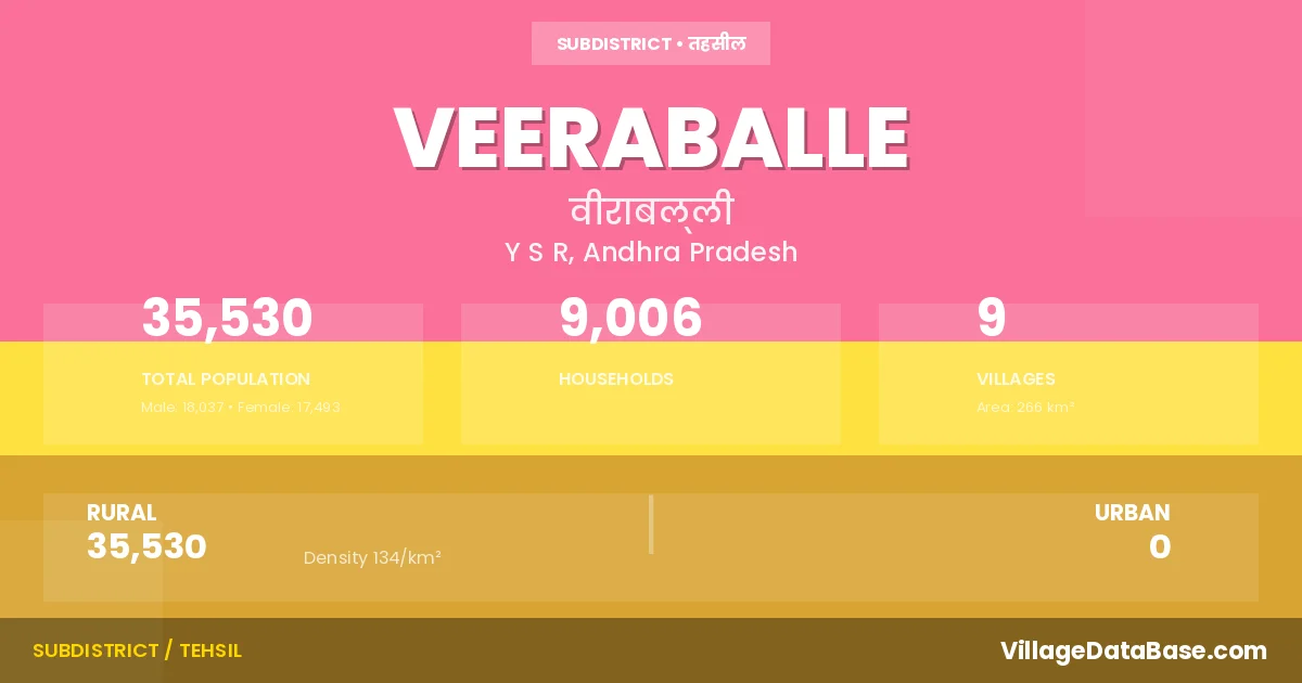 Veeraballe is a town and Mandal in the Y S R district of the Andhra Pradesh. In India, a Mandal is a subdivision of a district responsible for the administration and revenue collection of a specific area within the district. Mandals play a crucial role in the local governance structure, contributing significantly to the development and administration of their communities.
