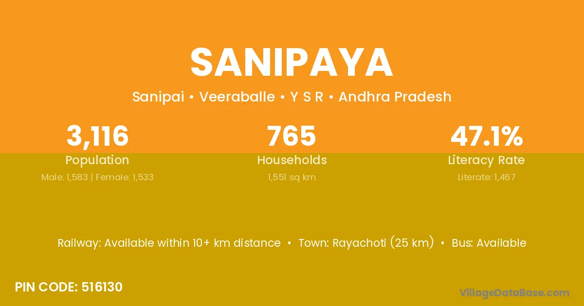 Rayachoti (25 km) is the nearest town to Sanipaya village for major economic activities and is located approximately 25 km away.