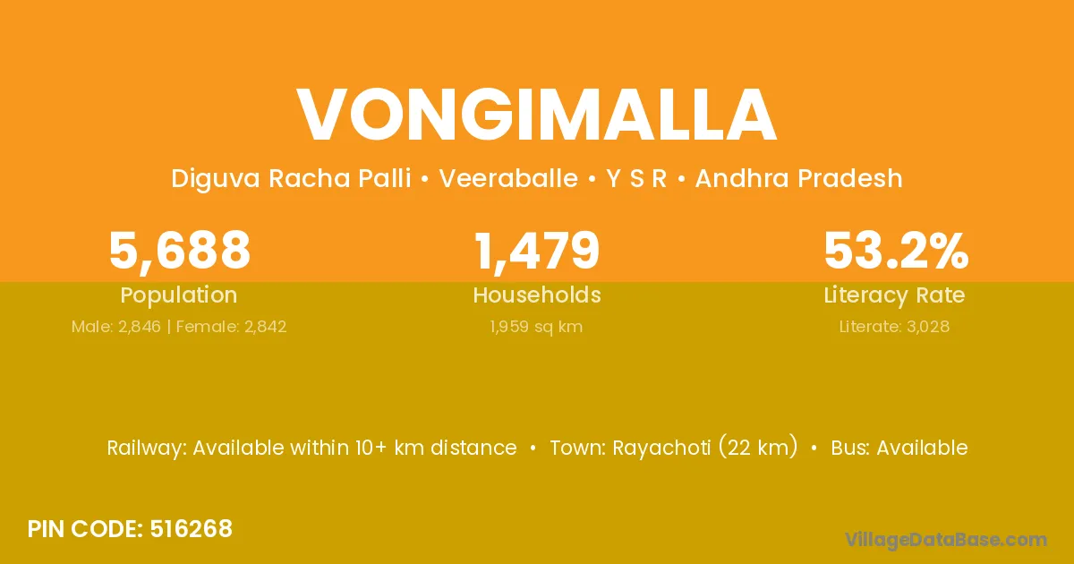Rayachoti (22 km) is the nearest town to Vongimalla village for major economic activities and is located approximately 22 km away.