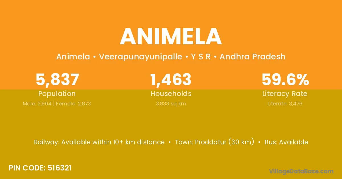 Animela village has a total population of 5,837 people, of which 2,964 are males and 2,873 are females.