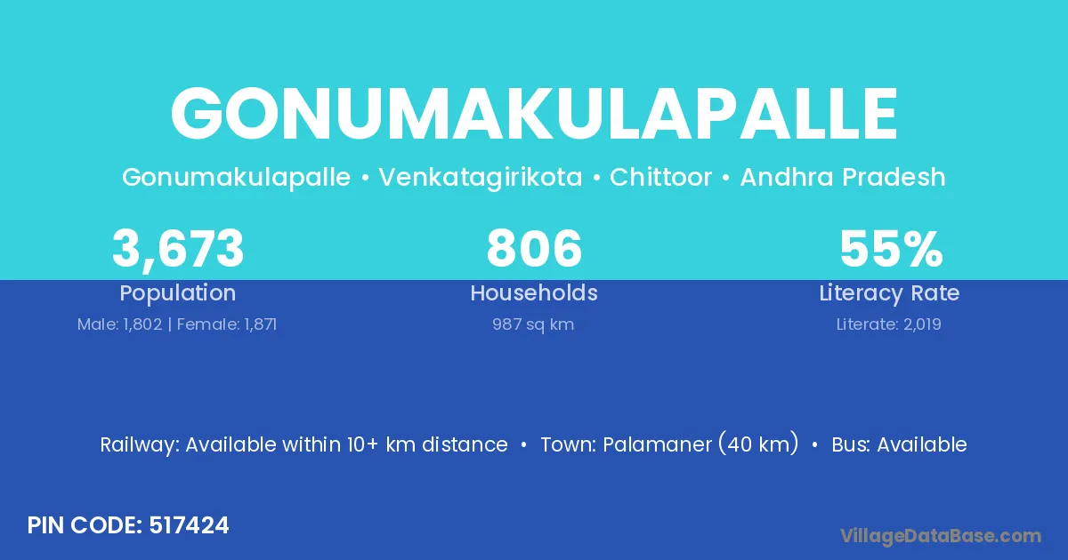 Proddatur (45 km) is the nearest town to Gonumakulapalle village for major economic activities and is located approximately 45 km away.