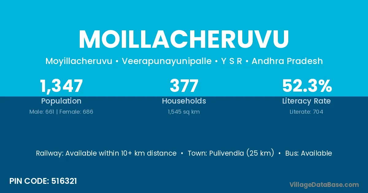 Pulivendla (25 km) is the nearest town to Moillacheruvu village for major economic activities and is located approximately 25 km away.
