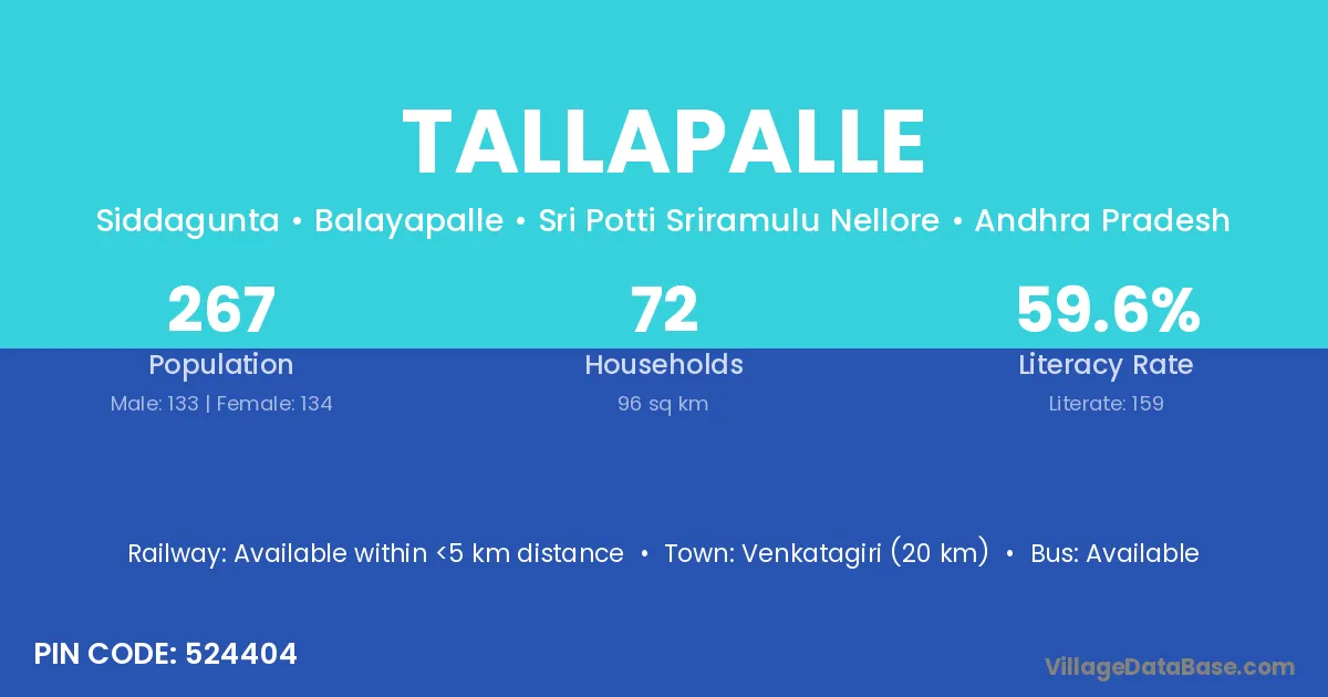 According to Census 2011 information, the village code of Tallapalle village is 516350.