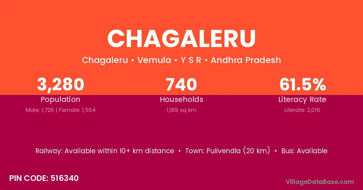 Pulivendla (20 km) is the nearest town to Chagaleru village for major economic activities and is located approximately 20 km away.