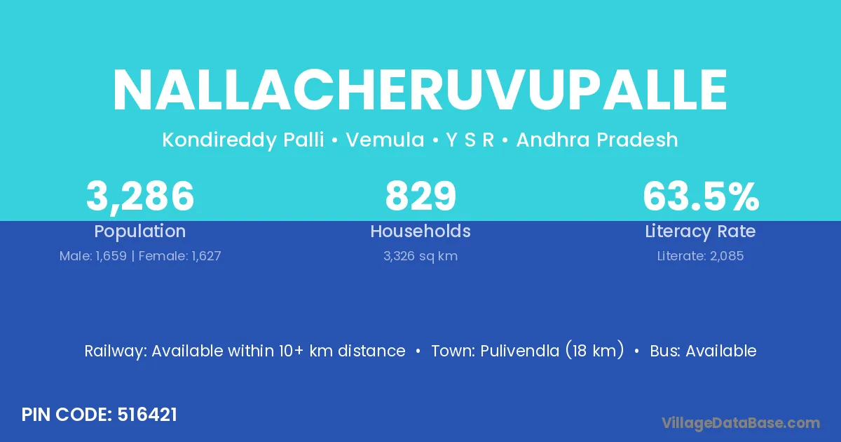 Pulivendla (18 km) is the nearest town to Nallacheruvupalle village for major economic activities and is located approximately 18 km away.