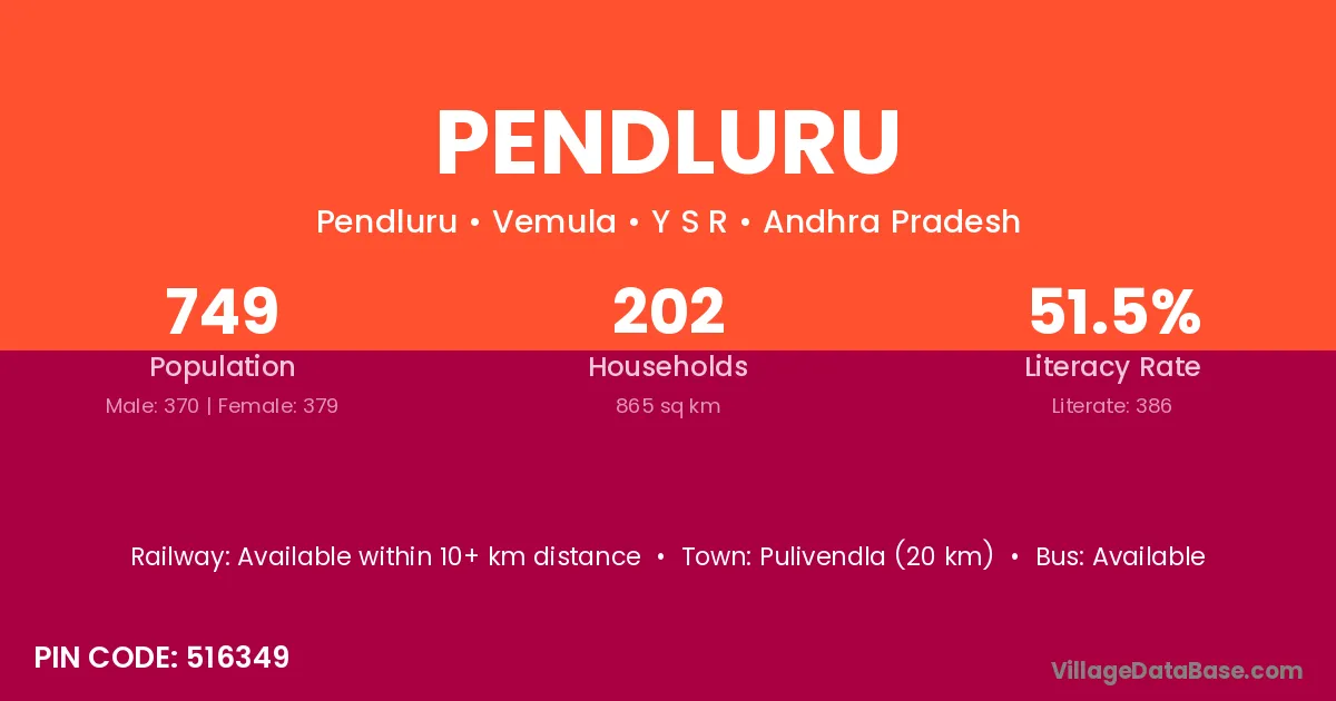 Pulivendla (20 km) is the nearest town to Pendluru village for major economic activities and is located approximately 20 km away.