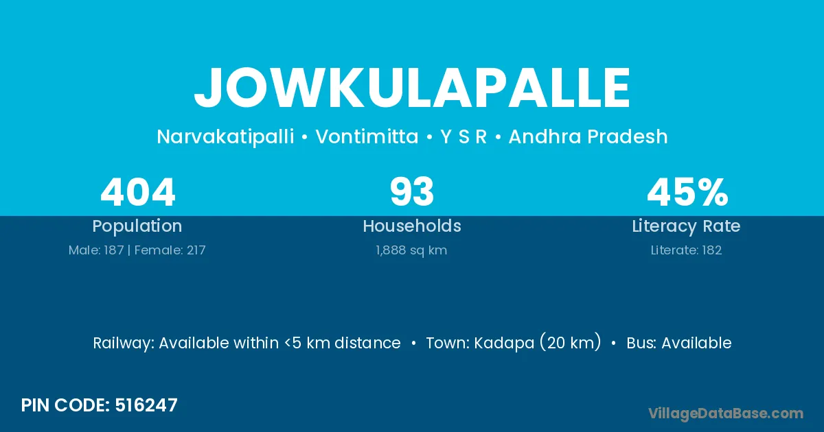 Kadapa (20 km) is the nearest town to Jowkulapalle village for major economic activities and is located approximately 20 km away.