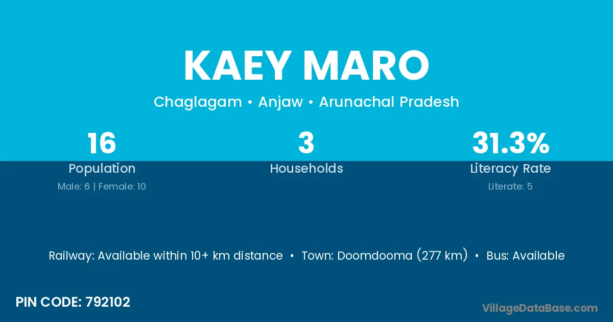 Doomdooma (277 km) is the nearest town to Kaey Maro village for major economic activities and is located approximately 277 km away.