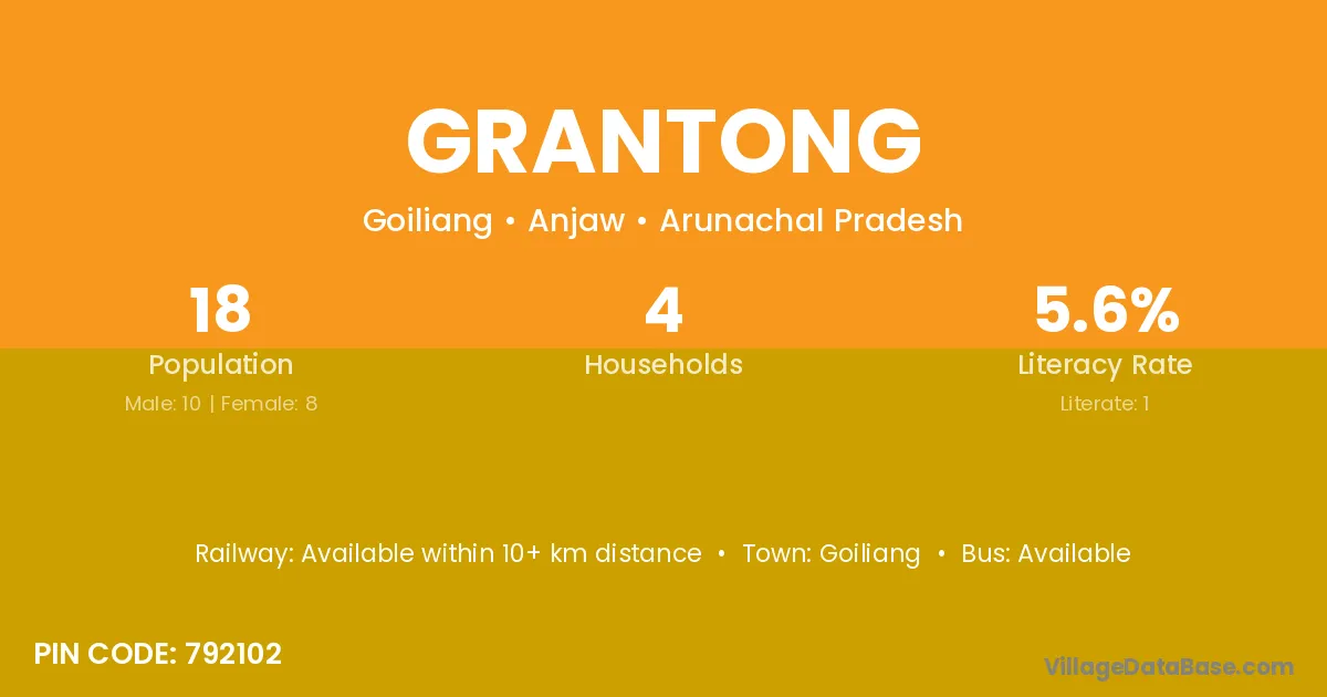 Grantong village has a total population of 18 people, of which 10 are males and 8 are females.