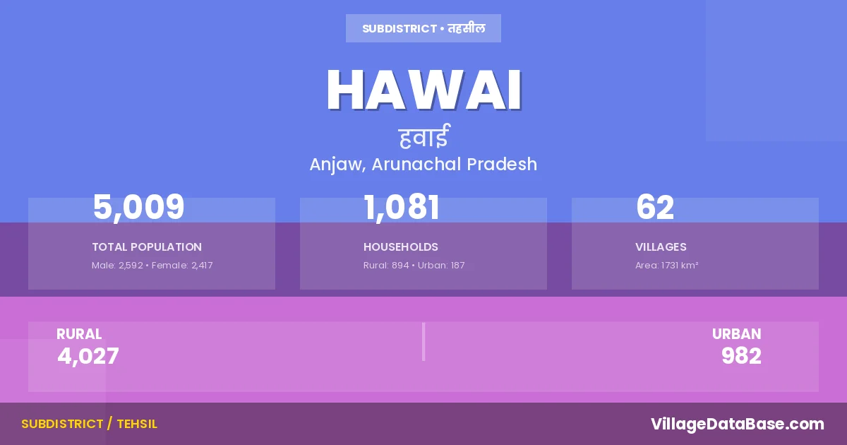 Hawai is a town and Circle in the Anjaw district of the Arunachal Pradesh. In India, a Circle is a subdivision of a district responsible for the administration and revenue collection of a specific area within the district. Circles play a crucial role in the local governance structure, contributing significantly to the development and administration of their communities.