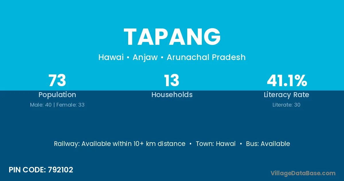 Tapang village has a total population of 73 people, of which 40 are males and 33 are females.