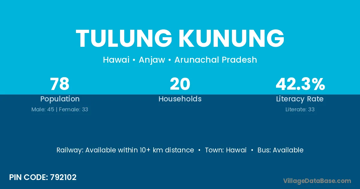 Tulung Kunung village has a total population of 78 people, of which 45 are males and 33 are females.