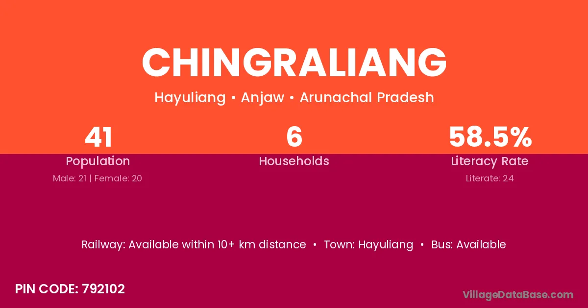 Chingraliang village has a total population of 41 people, of which 21 are males and 20 are females.