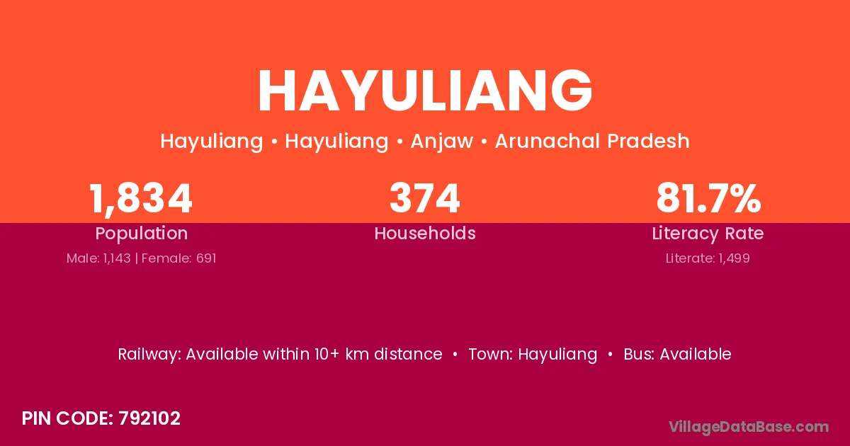 The literacy rate of Hayuliang village is 81.73%. Male literacy stands at 86.09% and female literacy at 74.53%.