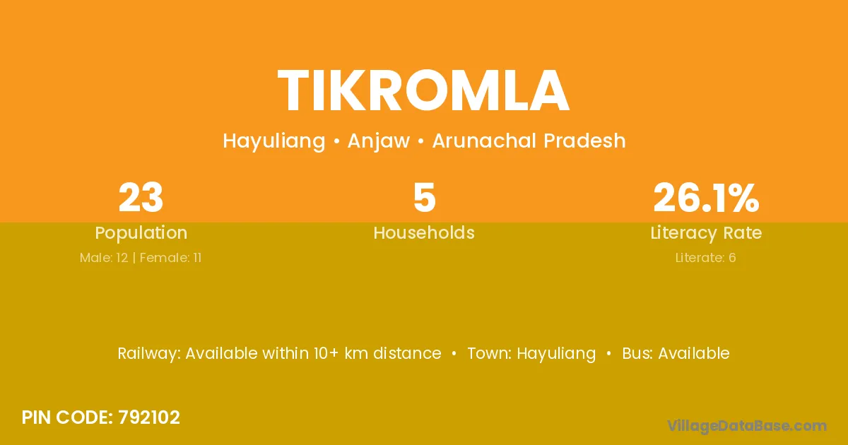 Tikromla village has a total population of 23 people, of which 12 are males and 11 are females.