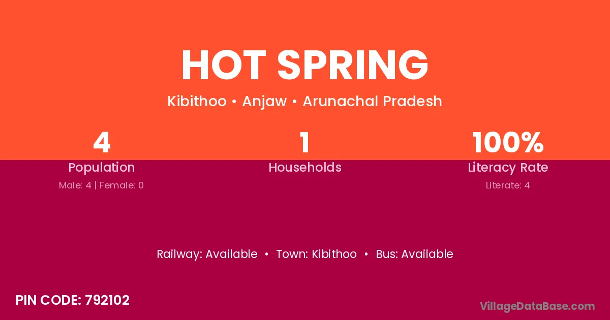 The literacy rate of Hot Spring village is 100.00%. Male literacy stands at 100.00% and female literacy at 0%.