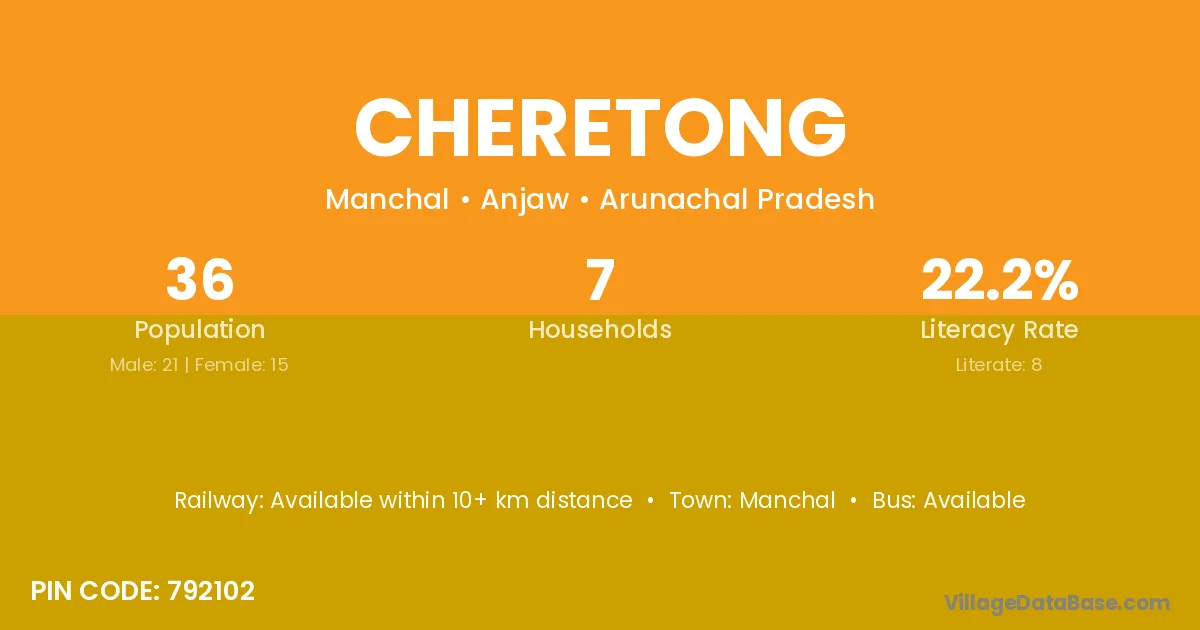 Cheretong village has a total population of 36 people, of which 21 are males and 15 are females.