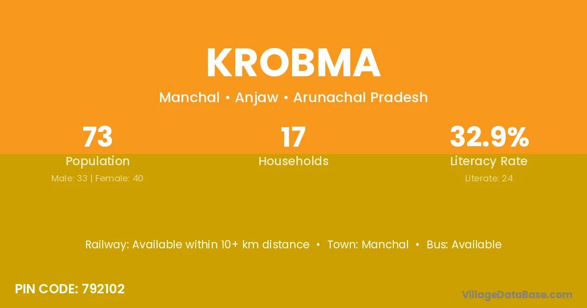 The literacy rate of Krobma village is 32.88%. Male literacy stands at 42.42% and female literacy at 25.00%.