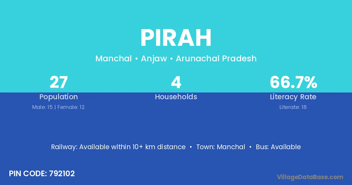 Pirah village has a total population of 27 people, of which 15 are males and 12 are females.