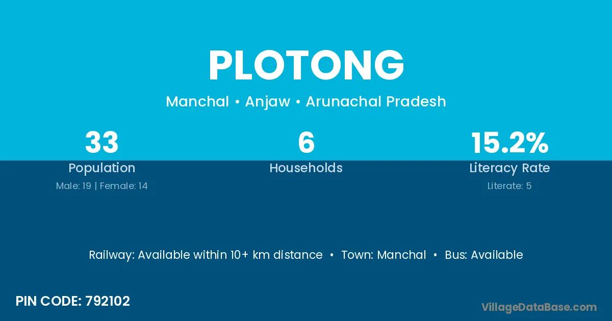 The literacy rate of Plotong village is 15.15%. Male literacy stands at 26.32% and female literacy at 0.00%.