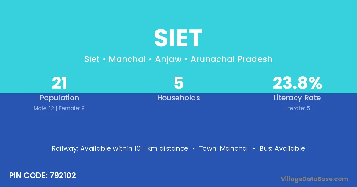 Siet village has a total population of 21 people, of which 12 are males and 9 are females.