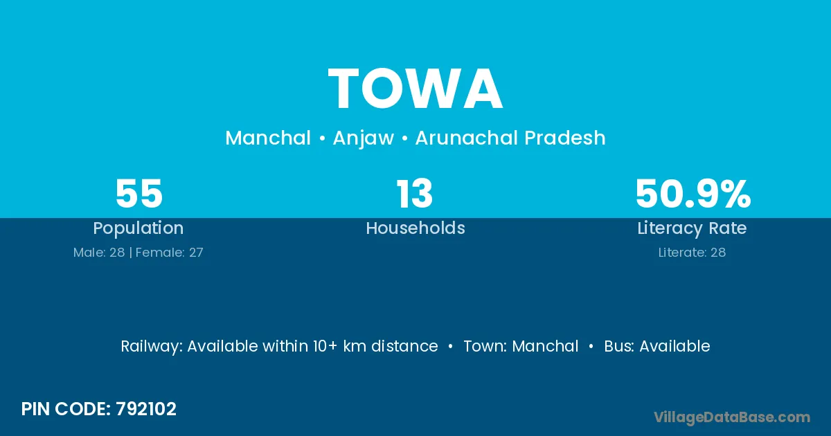 Towa village has a total population of 55 people, of which 28 are males and 27 are females.