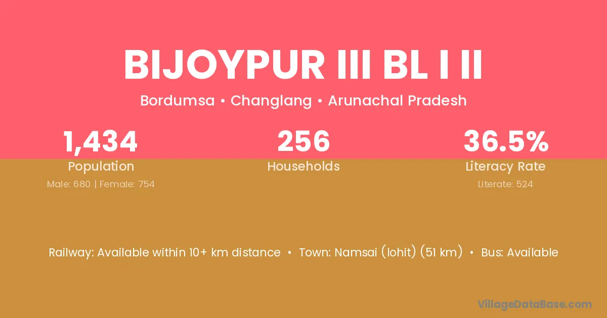 Namsai (lohit) (51 km) is the nearest town to Bijoypur Iii Bl I Ii village for major economic activities and is located approximately 51 km away.