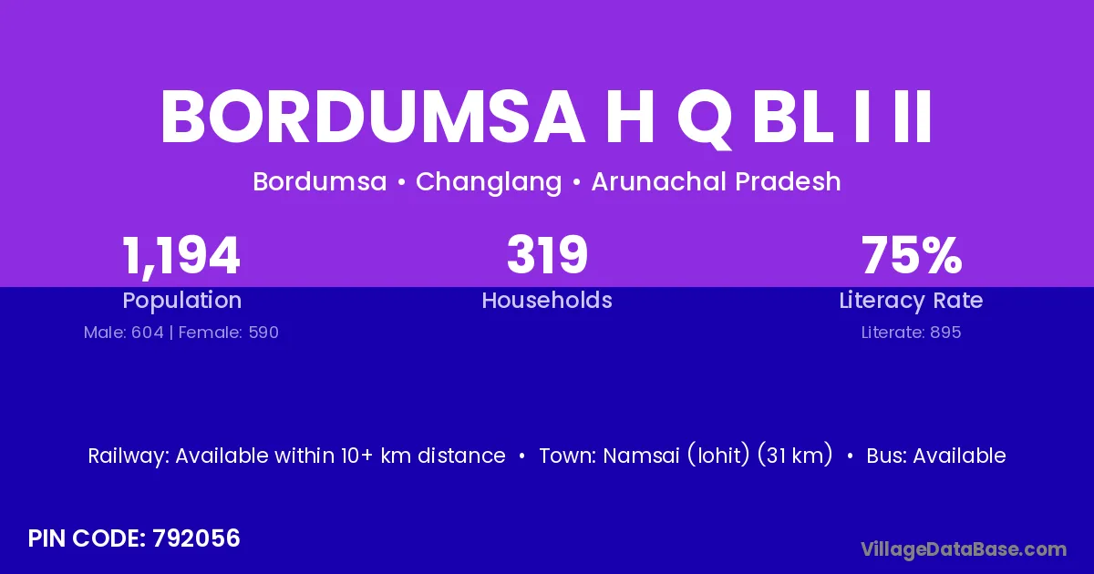 Bordumsa H Q Bl I Ii village has a total population of 1,194 people, of which 604 are males and 590 are females.