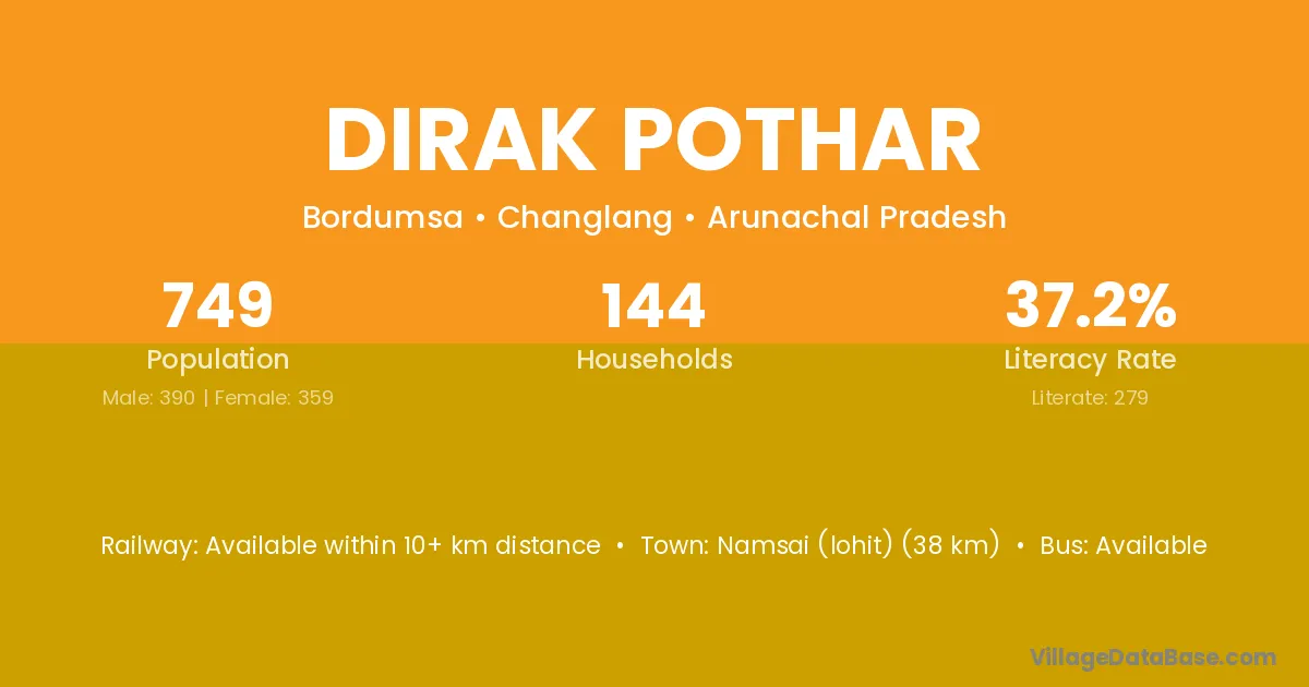Namsai (lohit) (38 km) is the nearest town to Dirak Pothar village for major economic activities and is located approximately 38 km away.