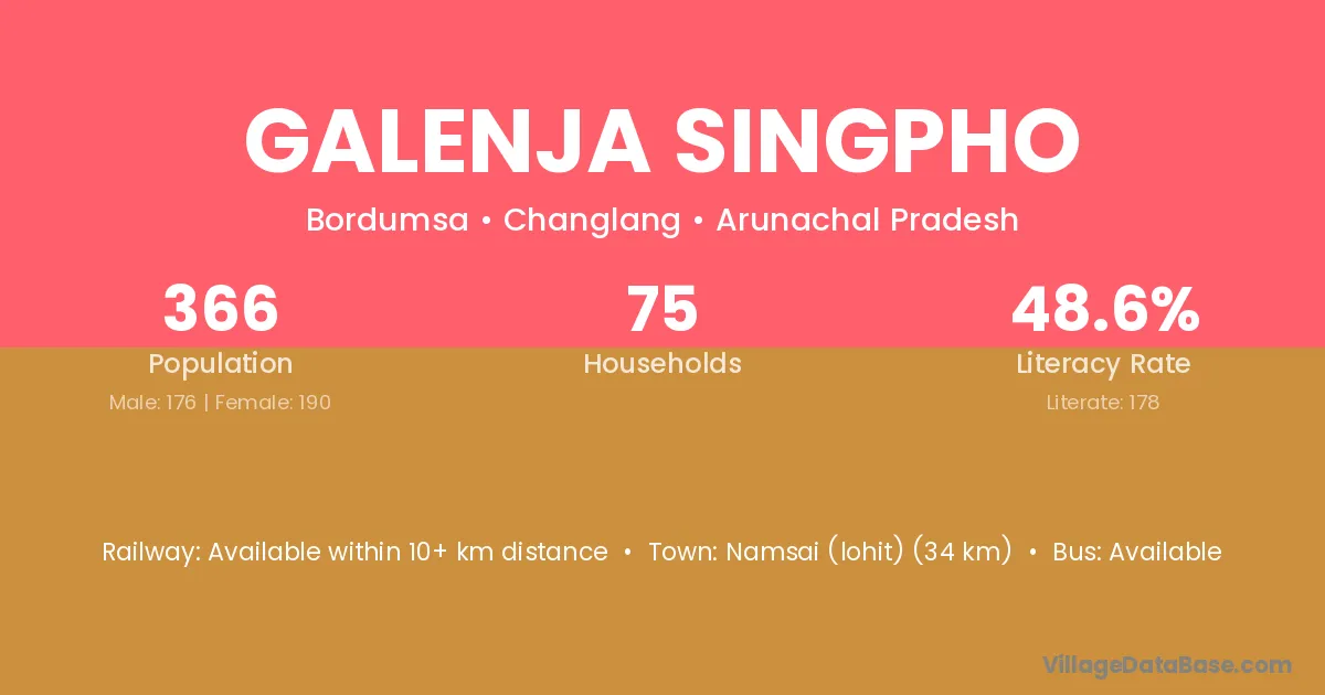 Namsai (lohit) (34 km) is the nearest town to Galenja Singpho village for major economic activities and is located approximately 34 km away.