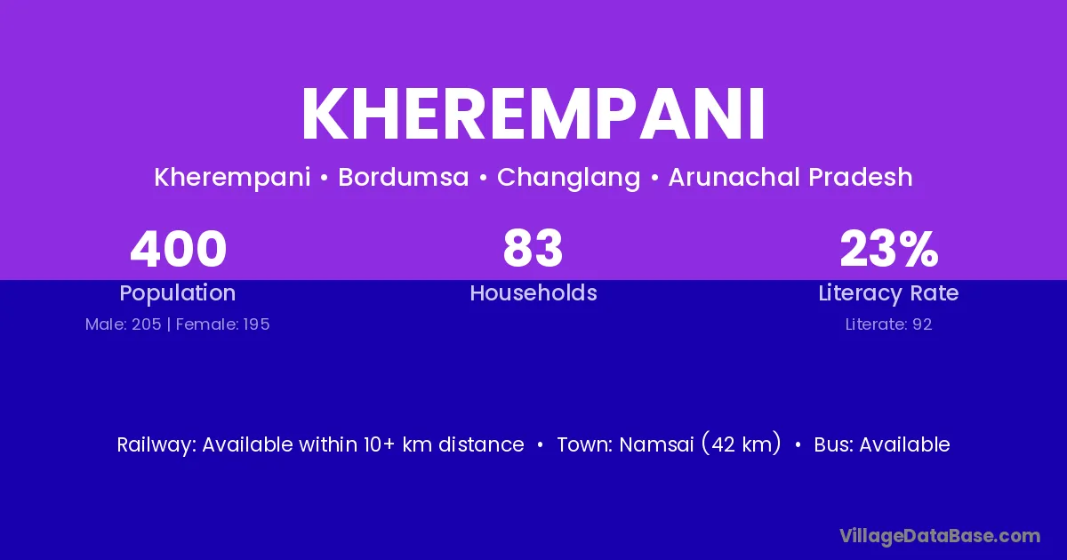 Namsai (42 km) is the nearest town to Kherempani village for major economic activities and is located approximately 42 km away.
