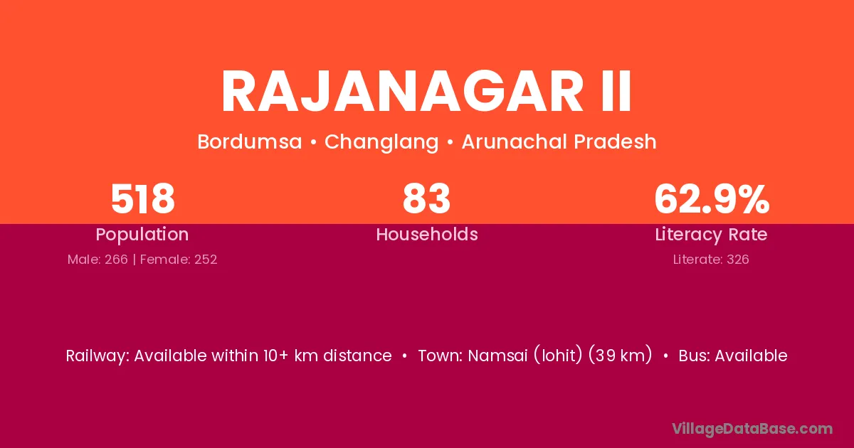 Namsai (lohit) (39 km) is the nearest town to Rajanagar Ii village for major economic activities and is located approximately 39 km away.