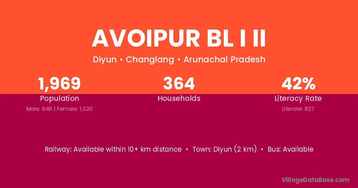 Diyun (2 km) is the nearest town to Avoipur Bl I Ii village for major economic activities and is located approximately 2 km away.