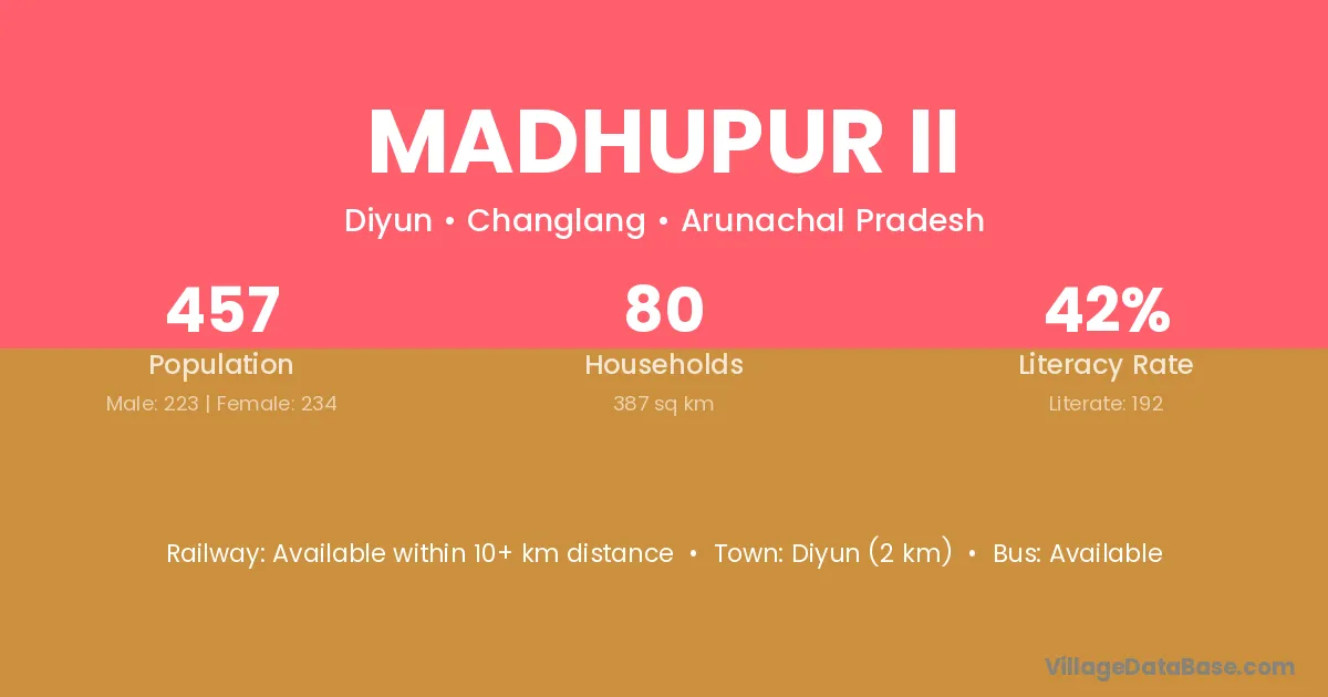 Diyun (2 km) is the nearest town to Madhupur Ii village for major economic activities and is located approximately 2 km away.