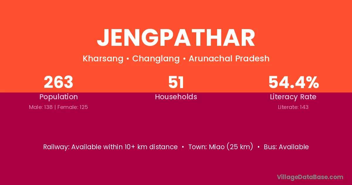 Miao (25 km) is the nearest town to Jengpathar village for major economic activities and is located approximately 25 km away.