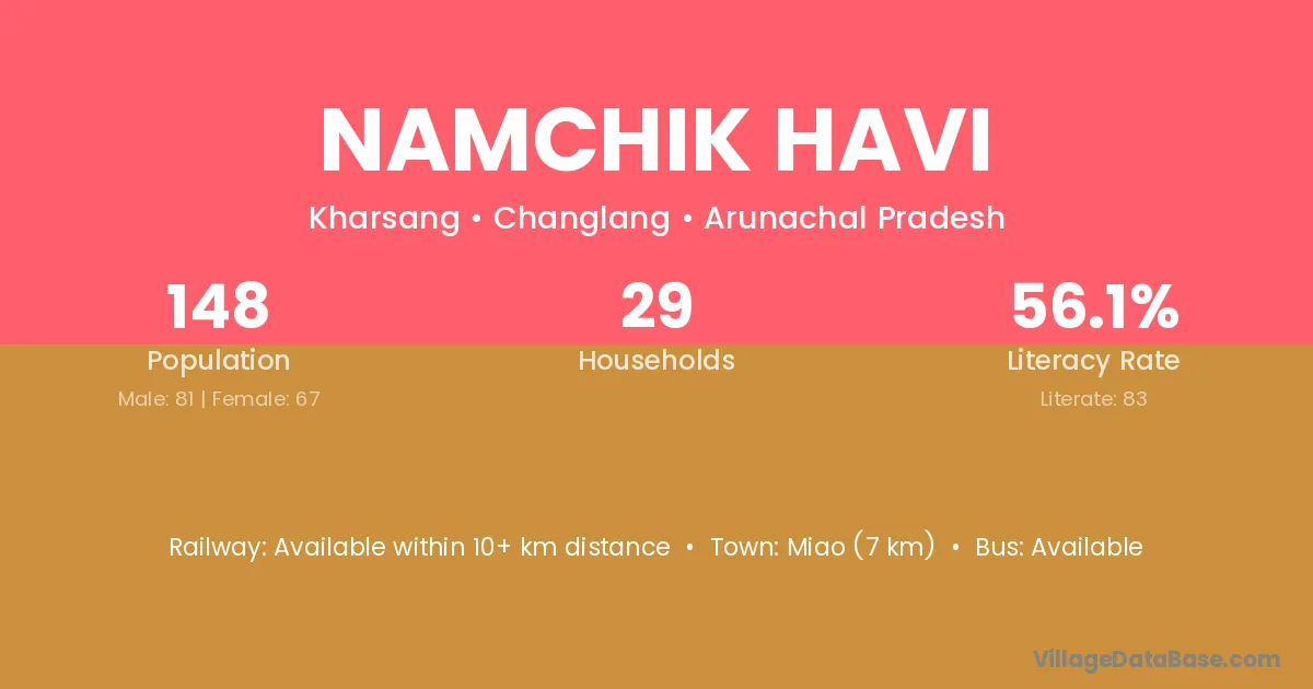 Miao (7 km) is the nearest town to Namchik Havi village for major economic activities and is located approximately 7 km away.