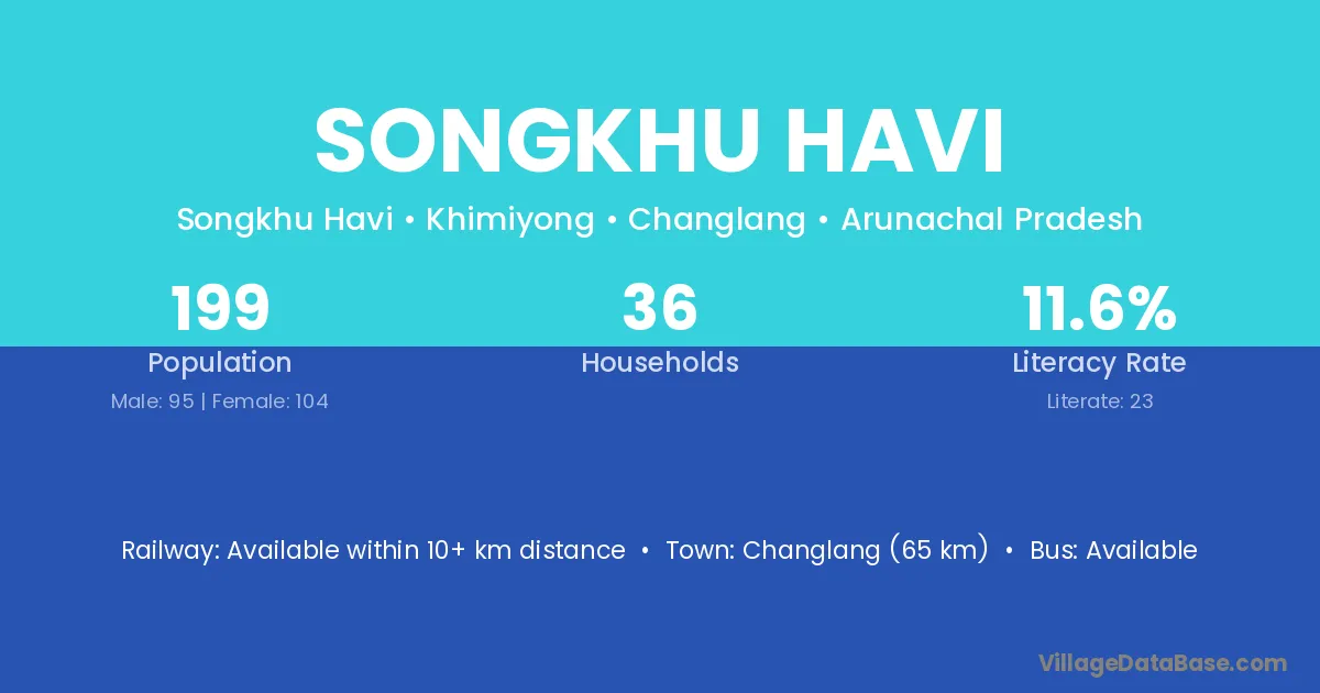 Changlang (65 km) is the nearest town to Songkhu Havi village for major economic activities and is located approximately 65 km away.