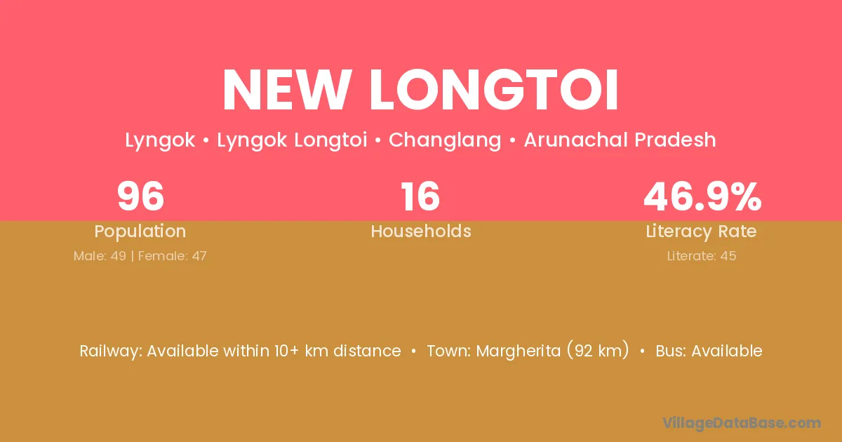 The literacy rate of New Longtoi village is 46.88%. Male literacy stands at 53.06% and female literacy at 40.43%.