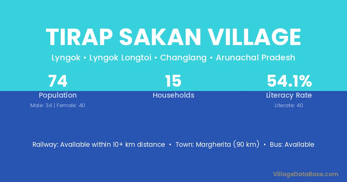 Tirap Sakan Village village has a total population of 74 people, of which 34 are males and 40 are females.