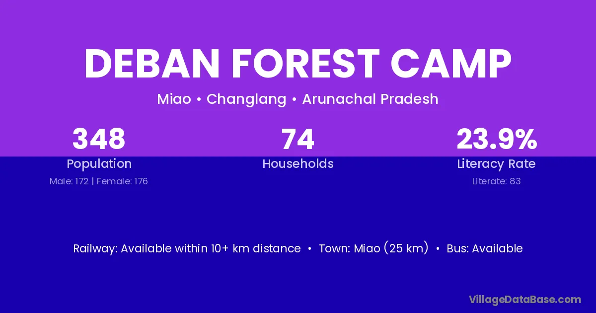 Deban Forest Camp village has a total population of 348 people, of which 172 are males and 176 are females.